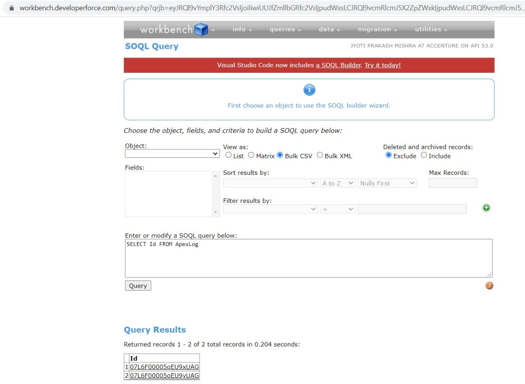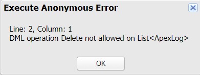 But sometimes it’s annoying as well, especially when log size is huge. With this it comes to our mind, why don’t we simply store the Ids in a list and delete the same in an anonymous window??? Well, we can’t do that because DML is not allowed on ApexLog object (But using REST callout it’s possible, but let’s not invest much time for this small job 😉).